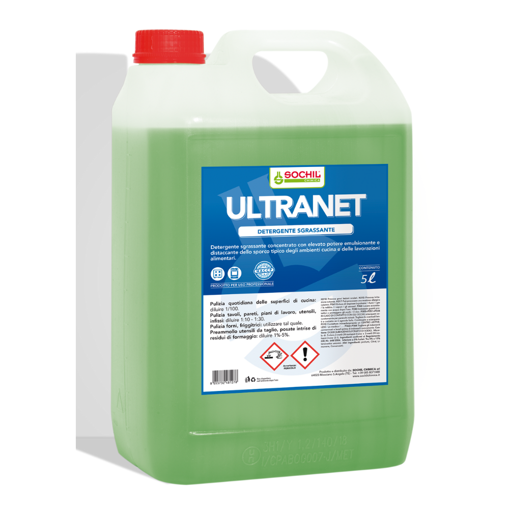ULTRANET è un detergente per la pulizia di qualsiasi genere di grasso, particolarmente indicato per le cucine e per i locali adibiti alle lavorazioni alimentari. ULTRANET esplica un’energica azione distaccante, emulsionante, antiridepositante dello sporco. ULTRANET agisce rapidamente negli interstizi più nascosti tirando fuori tutto lo sporco irraggiungibile per cui è indicato per le pulizie degli ambienti cucina. ULTRANET assicura una eccellente pulizia anche a basse concentrazioni grazie alla sua ricca formulazione. ULTRANET può essere utilizzato in piani di pulizia HACCP.