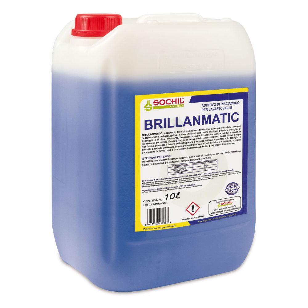 Il BRILLANMATIC, additivo in fase di risciacquo, determina sulle superfici delle stoviglie l’accelerazione dell’asciugatura. Il velo uniforme che copre bicchieri, posate e stoviglie, si assottiglia e si ritira lentamente, lasciando le superfici asciutte, senza residui e senza la presenza di goccioline d’acqua che, dopo l’evaporazione lascerebbero tracce di sali inorganici.
