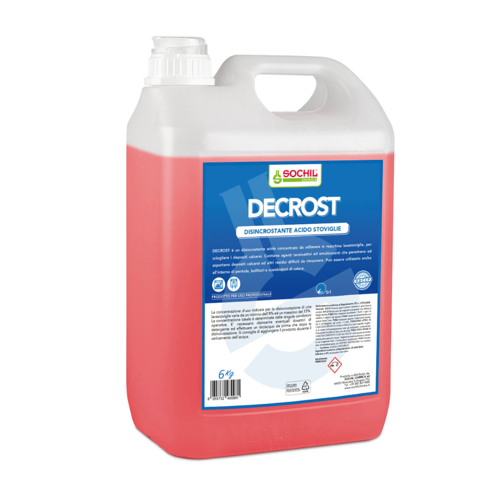 DECROST è un liquido disincrostante acido concentrato, da utilizzare in macchina lavastoviglie, per sciogliere i depositi calcarei. Contiene agenti tensioattivi ed emulsionanti che penetrano ed asportano depositi calcarei ed altri residui di difficile rimuovere. Può essere utilizzato anche all’interno di brasiere, pentole, bollitori e scambiatori di calore.